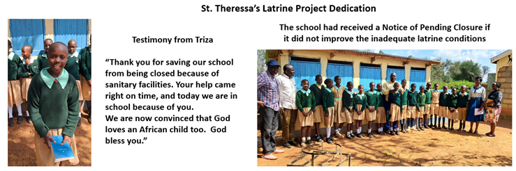 We are always astounded and blessed by the opportunities the Lord gives us to accomplish so much for so little. Our investment of less than $5000 on a new latrine at St. Theresa’s forestalled the imminent government closure of this school with nearly 1300 students.