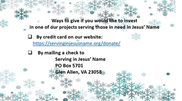 Serving in Jesus’ Name is a tax-exempt 501(c)3 non-profit organization, and donations are tax-deductible. We are an all-volunteer organization with 100% of all public donations going directly to our service projects. Visit us at servinginjesusname.org/